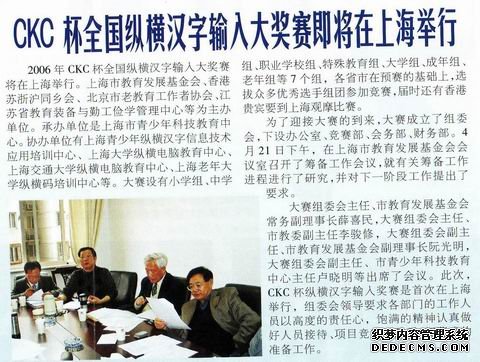 2006年CKC杯全国纵横汉字输入大奖赛将在上海举行。上海市教育发展基金会、香港苏浙沪同乡会、北京市老教育工作者协会、江苏省教育装备与勤工俭学管理中心等为主办单位。承办单位是上海市青少年科技教育中心。协办单位有上海青少年纵横汉字信息技术应用培训中心、上海大学纵横计算机教育中心、上海交通大学纵横计算机教育中心、上海老年大学纵横码培训中心等。大赛设有小学组、中学组、职业学校组、特殊教育组、大学组、成年组、老年组等7个组,各省市在预赛的基础上,选拔众多优秀选手组团参加竞赛,届时还有香港贵宾要到上海观摩比赛。