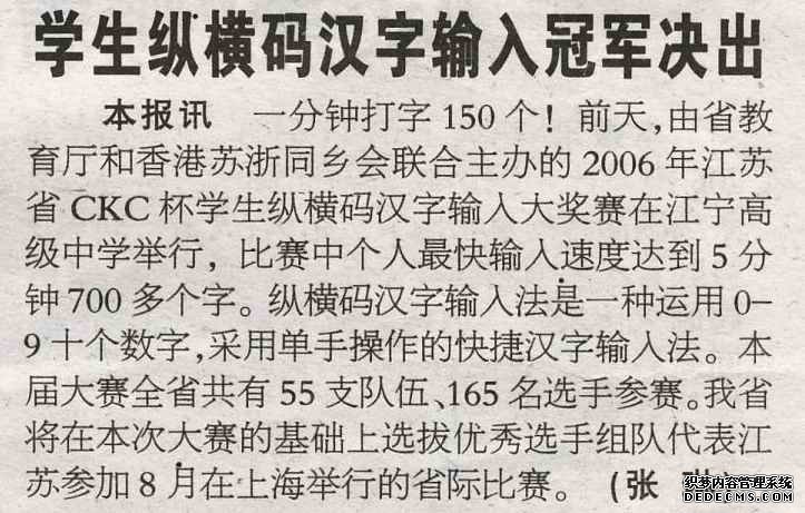 本报讯 一分钟打字150个!前天,由省教育厅和香港苏浙同乡会联合主办的2006年江苏省CKC杯学生纵横码汉字输入大奖赛在江宁高级中学举行,比赛中个人最快输入速度达到5分钟700多个字。纵横码汉字输入法是一种运用0-9十个数字,采用单手操作的快捷汉字输入法。本届大赛全省共有55支队伍、165名选手参赛。我省将在本次大赛的基础上选拔优秀选手组队代表江苏参加8月在上海举行的省际比赛。(张琳)