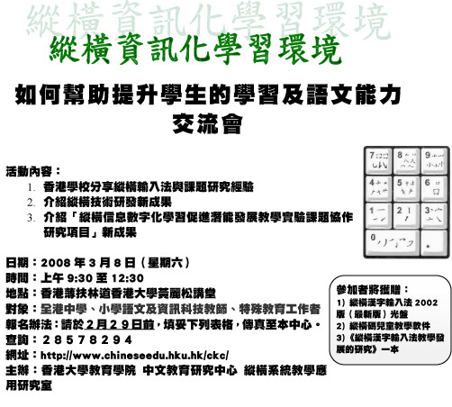 为推动交流香港地区「纵横信息化学习环境如何帮助提升学生的学习及语文能力」之各校宝贵经验,分享国内纵横信息数字化学习与研究实验总课题之成果,以及纵横信息化技术研发的最新成果,香港大学教育学院纵横系统教学应用研究室,谨订于二零零八年三月八日(星期六),于香港大学黄丽松讲堂举办「纵横信息化学习环境如何帮助提升学生的学习及语文能力交流会」。 |