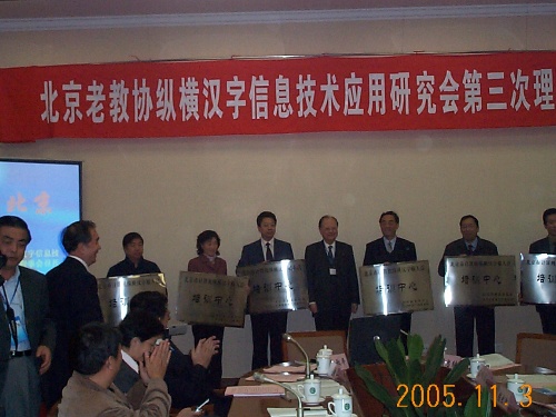 2、北京市昌平职业学校校长、北京老教协纵横汉字信息技术应用研究会常务理事段福生,在2005年第四届理事会上接受奖牌。