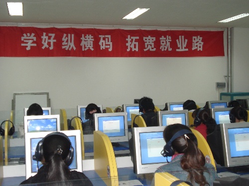 1、在新建3000平米的昌平职业学校培训中心计算机教室中,转岗农民正在学习纵横码操作技能。教室的正面悬挂着“学好纵横码拓宽就业路”的横幅标语。