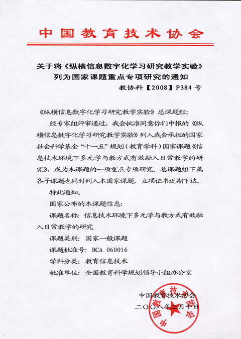 • 《纵横信息数字化学习研究教学实验》列为国家课题重点专项研究