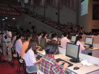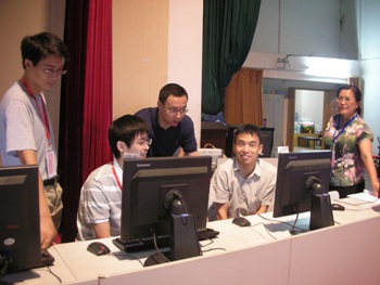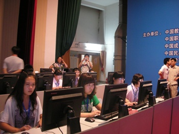 8月6日上午,研究所老师到达北京工业大学建国饭店,稍事休息即赶到北京工业大学礼堂的比赛场地,协助竞赛组技术人员做好软件安装、设备调试和软件测试等工作,由于本次比赛有香港和台湾的选手参加,我们特意重新安装了3台繁体电脑并且安装了繁体版本的输入法软件和比赛软件。
