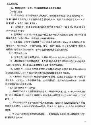 - 比赛形式:比赛采取赛奖分离形式,全部比赛均提前二周通过网络进行,网络比赛技术由苏州大学纵横汉字信息技术研究所支持。比赛文本届时抽取文本1(标准文本),文本2(备用文本)。