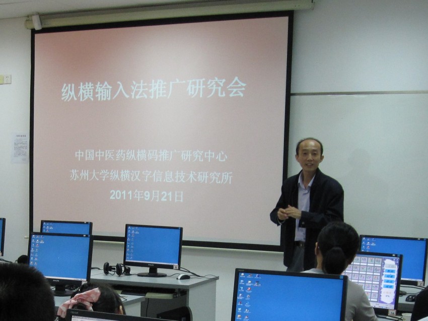 2011年9月21日,苏州大学纵横汉字信息技术研究所周克兰和丁宇芬老师受南京中医药大学信息技术学院邀请,参加纵横输入法推广研究会,进行纵横码的推广培训工作。本次研究会由“中国中医药纵横码推广研究中心”主办,地点在南京中医药大学的仙林校区的机房,参加者主要是仙林校区和翰林学院的16位计算机老师。