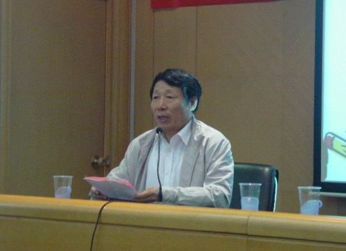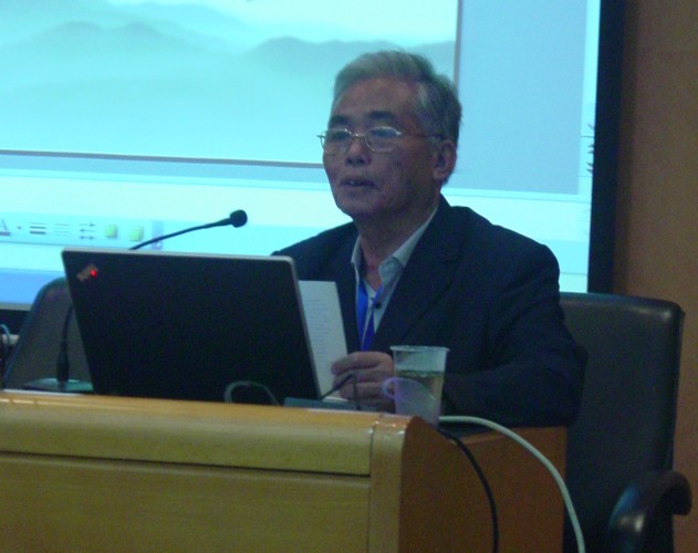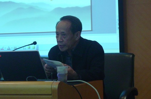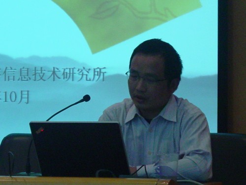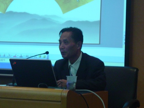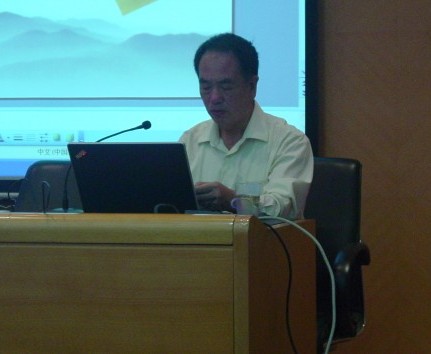 | 山东大学盛玉麒教授主持19日下午的学术交流 | 华绍和作题为“汉字键盘输入技术的回顾和展望”的报告 |