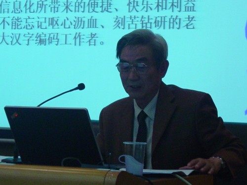 | 开幕式由中国中文信息学会汉字编码专业委员会主任委员华绍和主持 | 中国中文信息学会常务副会长曹佑琦研究员在开幕式上讲话 |