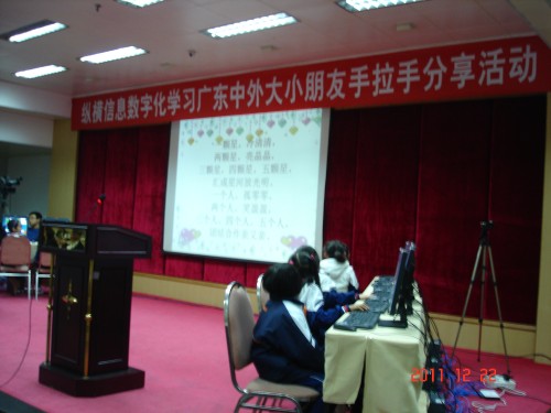 2011年12月22日,苏州大学纵横汉字信息技术研究所的张玉华、丁宇芬老师受纵横信息数字化学习研究教学实验总课题组邀请,赴广州参加“纵横信息数字化学习广东中外大小朋友手拉手分享活动”。此次活动由中国教育学会学校文化研究分会主办,广东省社会科学界联合会、广东省电化教育馆、广东教育学会中小学信息技术教育、教育技术专业委员会、中小学语文专业委员会、中国教育学会学校文化研究分会广东项目办、总课题组秘书处等协办。研究所老师参加了分享活动,还向与会者介绍了纵横输入法2011简体版套件的新功能。