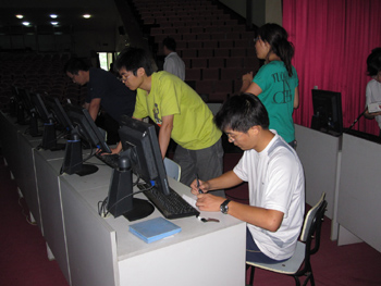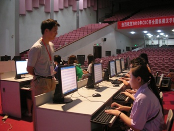 8月6日上午,研究所老师到达北京工业大学建国饭店,稍事休息即赶到北京工业大学礼堂的比赛场地,协助竞赛组技术人员做好软件安装、设备调试和软件测试等工作,由于本次比赛有香港和台湾的选手参加,我们特意重新安装了3台繁体电脑并且安装了繁体版本的输入法软件和比赛软件。