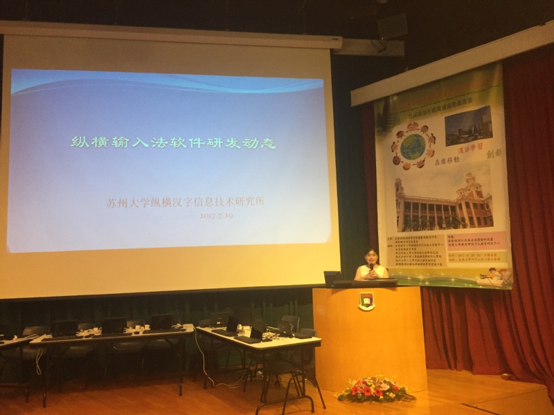 参会前,周克兰和张玉华老师为大会发言做了精心准备,制作了详尽的演示PPT;在大会上,张玉华老师做了“纵横输入法软件研发动态”的大会报告。她首先简单介绍了苏州大学纵横研究所与纵横码发明人周忠继先生长达25年的合作,介绍了纵横编码的基本思想;然后分别介绍了纵横输入法2016繁体版、纵横输入法手机版教学软件、手机版比赛软件、在线打字系统以及不同手机下的纵横输入法软件。